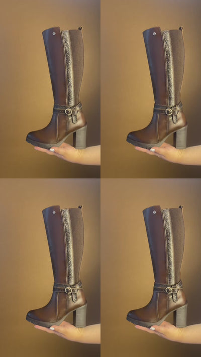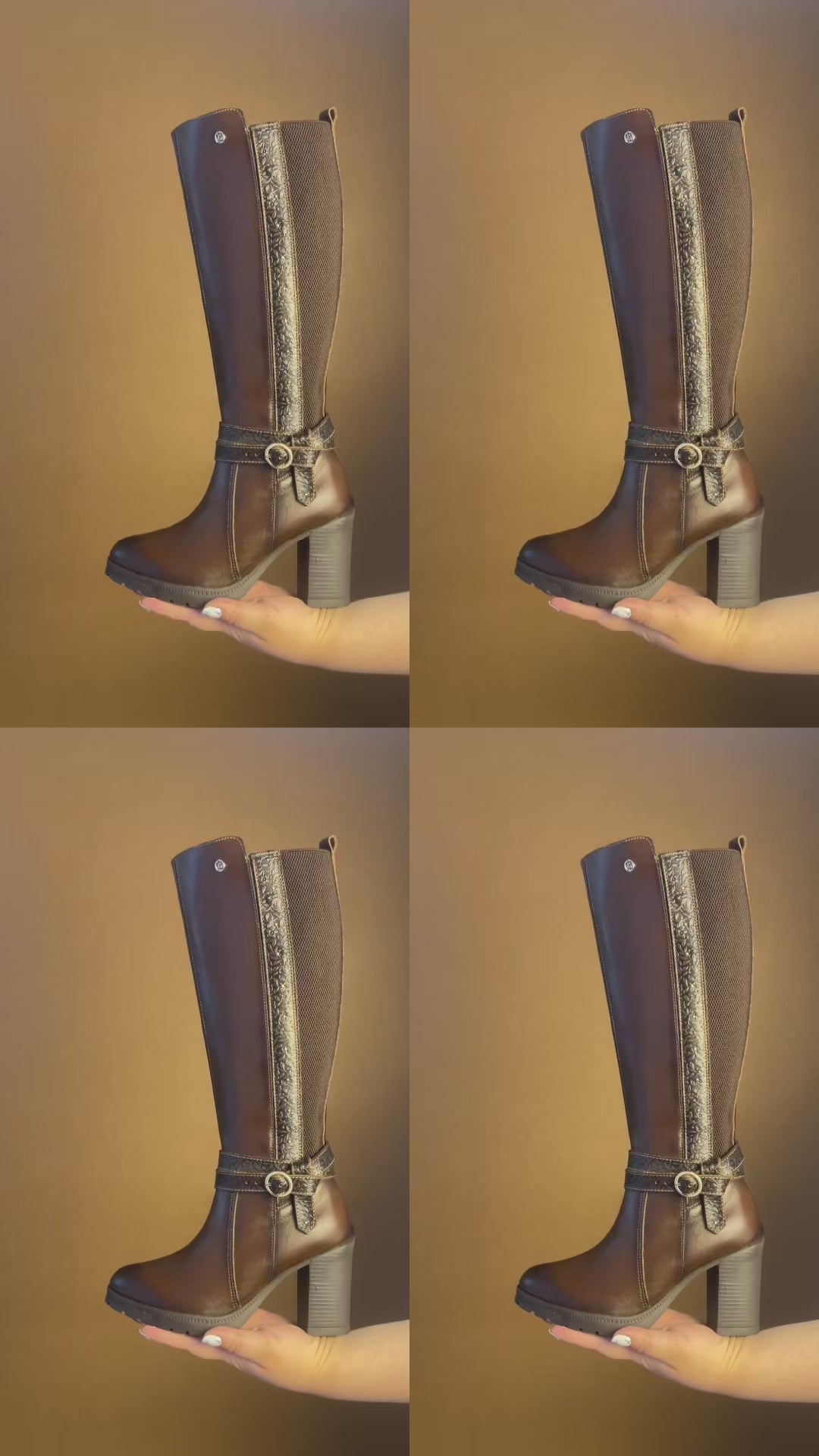 Esta bota alta para dama combina elegancia y comodidad con un diseño en piel color brandy que realza su sofisticación. Cuenta con un detalle elástico en la parte trasera que facilita el calce, mientras que una hebilla decorativa y estoperoles aportan un toque vanguardista y refinado. Perfecta para complementar estilos formales o casuales con un aire moderno y distinguido.